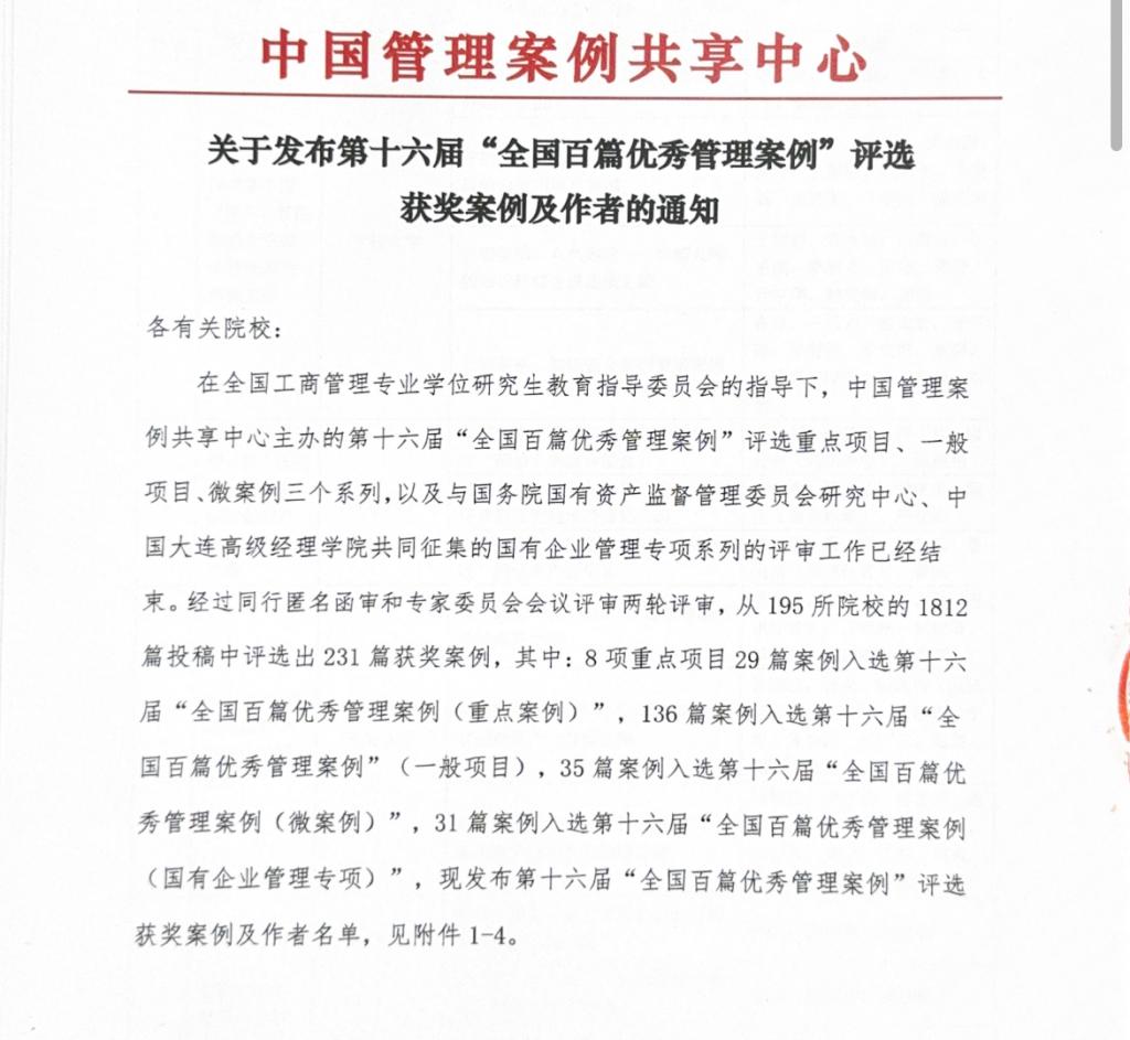 本届“全国百篇优秀管理案例”经过同行匿名函审和专家委员会会议评审两轮评审,从195所院校的1812篇投稿中评选出231篇获奖案例。其中:7所院校的8个项目29篇案例入选第十六届“全国百篇优秀管理案例(重点案例)”,72所院校的136篇案例入选第十六届“全国百篇优秀管理案例(一般项目)”,26所院校的35篇案例入选第十六届“全国百篇优秀管理案例(微案例)”,24所院校的31篇案例入选第十六届“全国百篇优秀管理案例(国有企业管理专项)”。